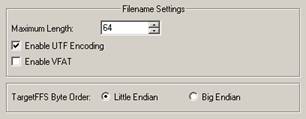 The file system settings include the maximum file name length. This must correspond to the FILENAME_MAX value used by the target file system. It also contains checkboxes to indicate whether UTF file name encoding and VFAT support (long FAT file names) are enabled in the target software. These features are enabled by the UTF_ENABLED and VFAT_ENABLED definitions, respectively, in ‘config.h’.