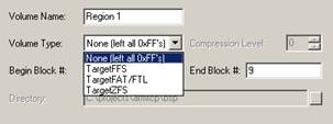 There are four types of regions. As shown below, the selections are: TargetFFS volume, TargetFAT/TargetFTL volume, TargetZFS volume, or “None”, to indicate a region that is left as all 0xFF bytes.