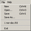 TFSImage has two menu bar entries: File and Help. The New, Open, Save, Save As, history, and Exit choices in the File menu apply to .tfd settings files. The Help menu entry brings up the ‘About’ dialog.