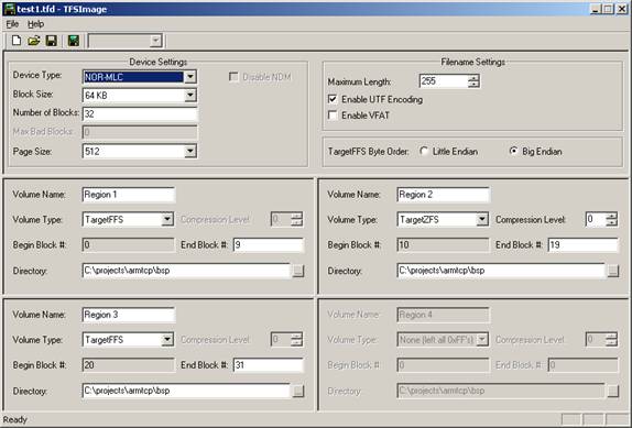 There are four types of regions. As shown below, the selections are: TargetFFS volume, TargetFAT/TargetFTL volume, TargetZFS volume, or “None”, to indicate a region that is left as all 0xFF bytes.