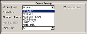 The Device Settings panel holds settings for the flash device type, the erasable block size, the total number of erasable blocks, the maximum bad block count (NAND devices only), and the page size. As shown below, the available device type choices are Single Level Cell (SLC) NOR, Multi Level Cell (MLC) NOR, M18 Sibley NOR (Numonyx), Eclipse NOR (Spansion), SLC NAND, and MLC NAND.